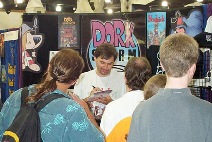 Next year, I can’t do this again. At least not the way Dork Storm did it this year. The conventions are getting too big and too hectic, and they take too much out of me. So I’m hereby announcing that 2001 will be the LAST Dork Tower World Tour Death March as they are now known. I just can’t keep up with the schedules and keep cartooning and hope to do my best work.