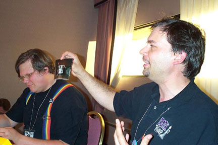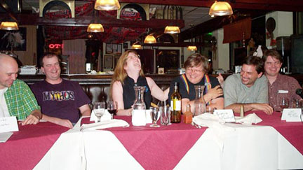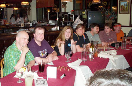 Left to right, the players included John Lewis, Andy Dawson, Kaya Folglio. Phil Foglio, me, James Ernest and Doc Cross. Aaron Williams and a few others got cut out of the frame. Unintentionally. Honest.