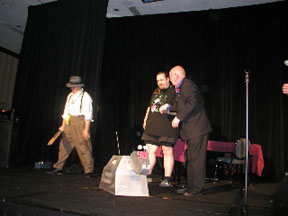 Within minutes of our arrival (the lovely and talented Judith came along), another guest (irrepressible British actor Michael Sheard, above, about to whack K-9 during the closing ceremonies) was foisting whiskey on us. It was a good sign.