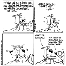 As for the proposal itself, I knew it had to be special. It had to be memorable, and it had to be ME. In other words, it had to be something grand and sweeping and ill-conceived. So I chose to do it in “Wild Life,” my daily comic strip.