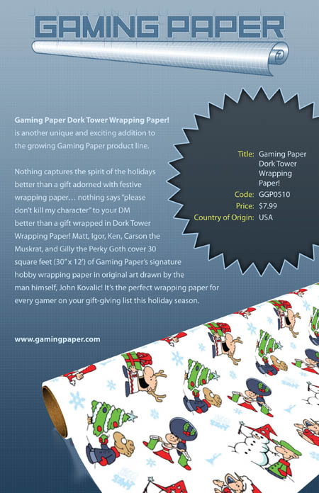 Nothing captures the spirit of the holidays better than a gift adorned with festive wrapping paper… nothing says “please don’t kill my character” to your DM better than a gift wrapped in Dork Tower Wrapping Paper! Matt, Igor, Ken, Carson the Muskrat, and Gilly the Perky Goth cover 30 square feet (30” x 12’) of Gaming Paper’s signature hobby wrapping paper in original art drawn by the man himself, John Kovalic! It’s the perfect wrapping paper for
