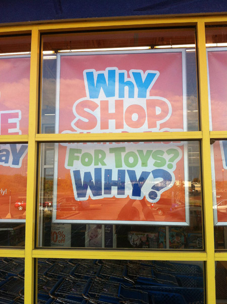 A bit existential, for a toy store. Particularly a big-box one. Still, questioning the reason for one’s existence is seldom a bad thing…