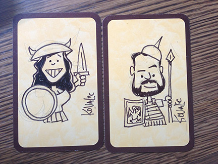 On occasion, I’m asked to draw people on Munchkin cards,or in the Munchkin style, and I’m quite happy with the results. You probably don’t know these folks, but trust me: all parties involved were very pleased with these: