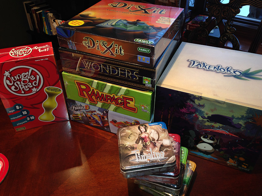 There’s still time to buy a table for this, and have me be your waiter. I’ve already got a table of 12 to look after, but I promise I won’t spill soup on you (NOTE: I cannot, actually, promise this). Not only that, but my friends at various games companies are sending magnificent lots for the silent auction! There’ll be incredibly cool packages from Steve Jackson Games, Asmodee, Cryptozoic, and of course, Out of the Box. I mean, look what just arrived from Asmodee: