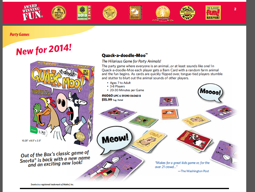 GUYS!  I am so very very very very stoked about this one! Out of the Box Games just  announced that they are re-releasing the hilarious, silly, noisy party game SNORTA, with a new name and a new look! QUACK-A-DOODLE-MOO!