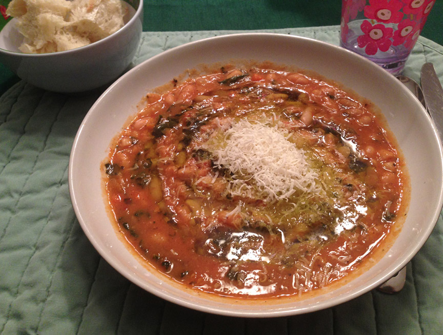 Anyway, point being, the ribollta I made last night is helping. It’s a delicious Tuscan bean stew that I discovered at Madison’s rather wonderful Osteria Papavero, and it’s become one of my favorite Winter comfort dishes. Most importantly, it’s not only delicious, but it’s soft. Soft is very, very, VERY good, right now.