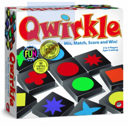 Here’s what Qwirkle, by Mindware Games. looks like. It should be available just about anywhere. I’m pretty sure it’s in the mass market. It’s a terrific little game best described as “Scrabble with shapes and colors.” But without board. And yes, sometimes the layout gets awkward.