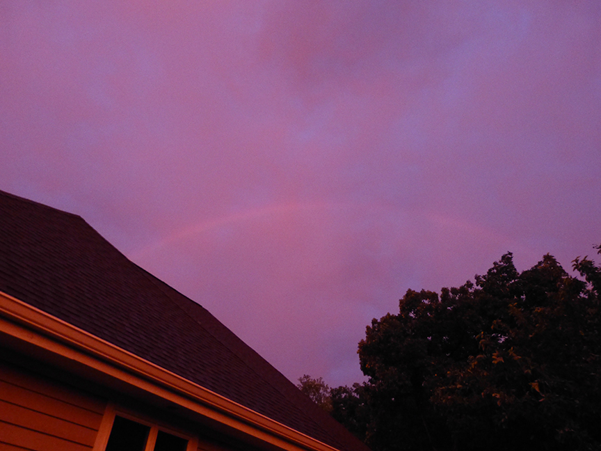 Last night, though, around sunset, there was a break in the storms, creating some of the most amazing colors I’ve ever seen splashed across the sky. Brilliant oranges in the west and north, dazzling purples in the east and south. There was even a rainbow, if you looked hard enough. The city was bathed in science-fiction hues that these few photos do poor justice to.
