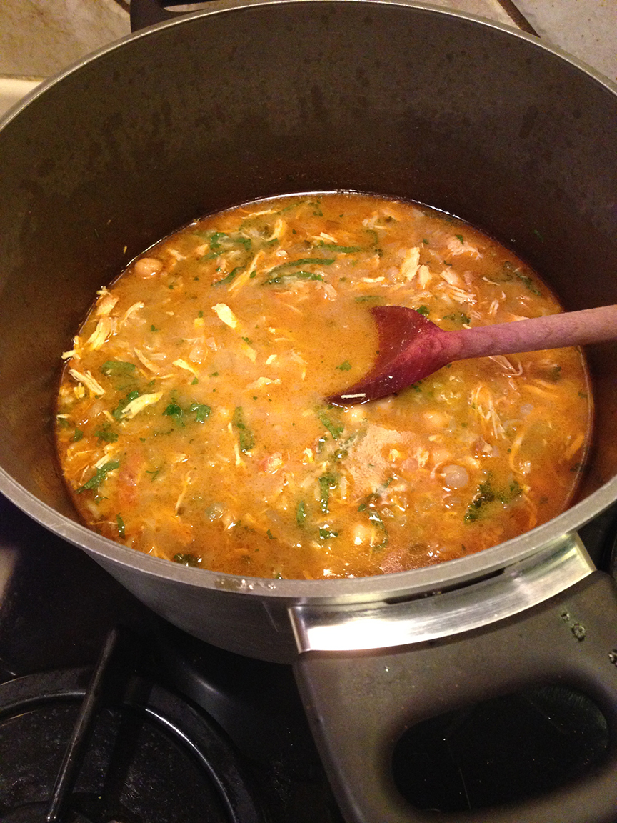 (Tip: Assuming you don’t have that lovely large tagine-style chicken breast on-hand that I did, simmer a chicken breast on the bone in the soup as soon as you add the stock, then remove at the end, let cool, and shred, for a nifty flavor enhancement.)