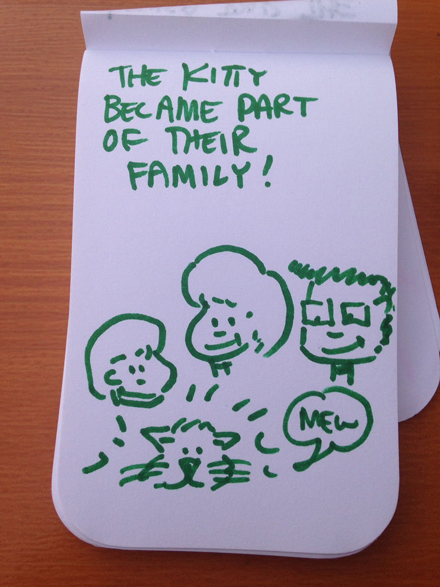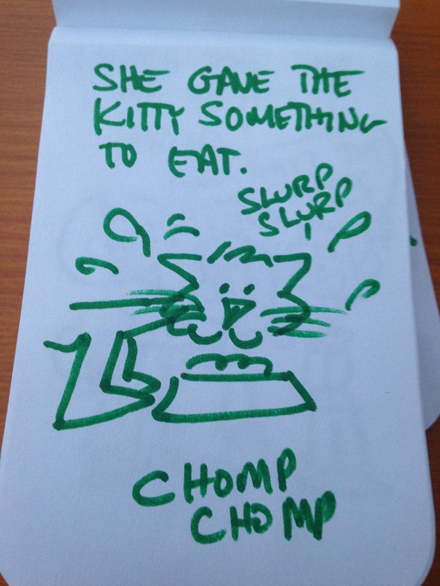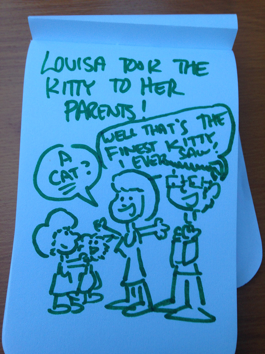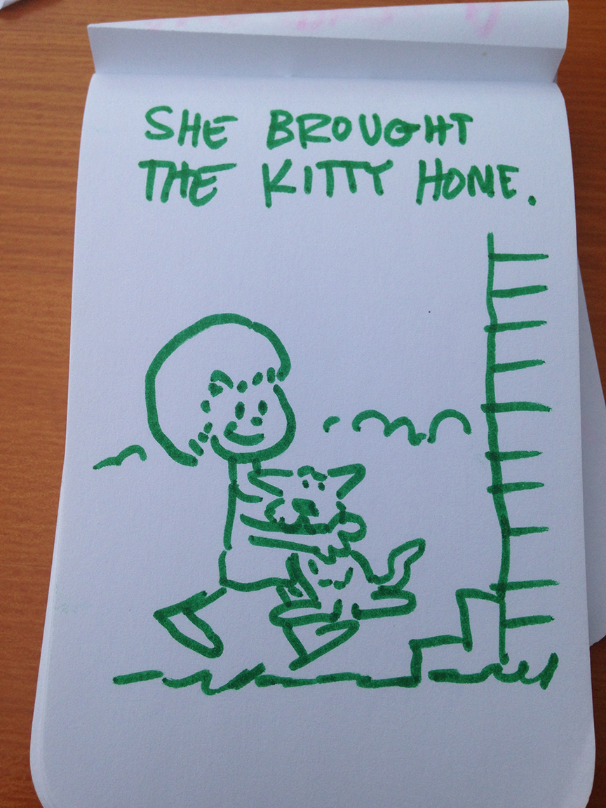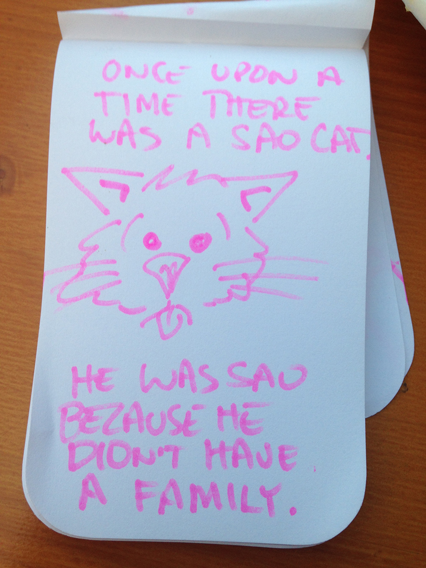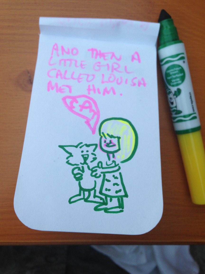 So the other day, sitting outside the Cafe Bavaria in downtown Wauwatosa, Daughter, Age 5, found a small notebook in her backpack. And she wanted us to make a book.