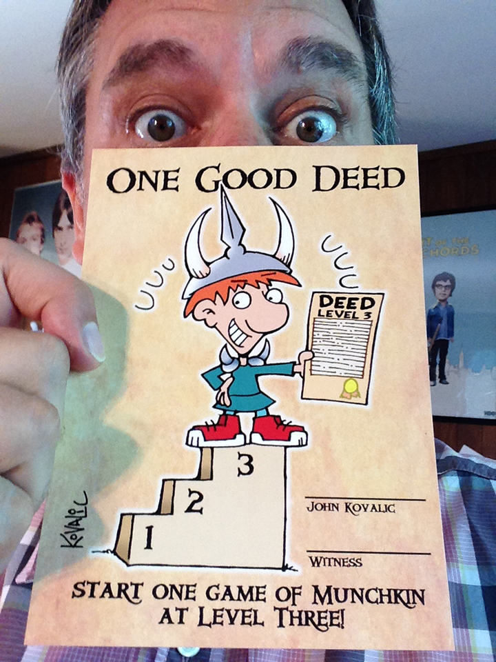 ALSO, if you pledge $15 or more (though please pledge more, if you can) I’ll send you the ONE GOOD DEED Munchkin postcard, letting you start a game at Level 3, thanks to Steve Jackson Games! I’ll mail these anywhere in the world. And YUP – the cards are in, and done, and I should start sending them out in a couple of weeks. This may take some time, as between this year and last yer, there have been hundreds of pledges. But WOOOOOT! They’re in!