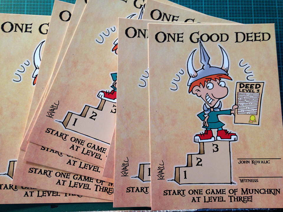 Not only THAT, but if you pledge $15 or more (PLEASE pledge more),you’ll get a VERY limited-edition authorized Munchkin Postcard of ONE GOOD DEED, which I’ll sign, letting you start one game at Level 3!