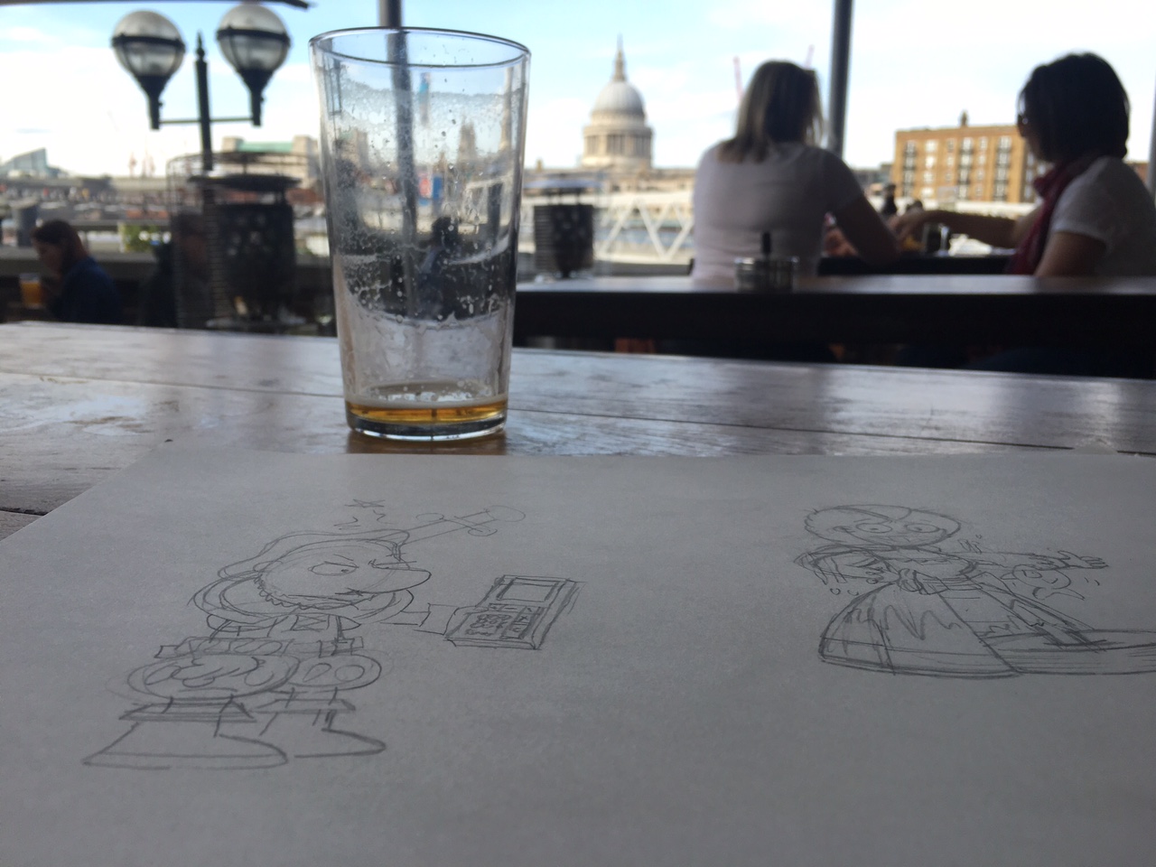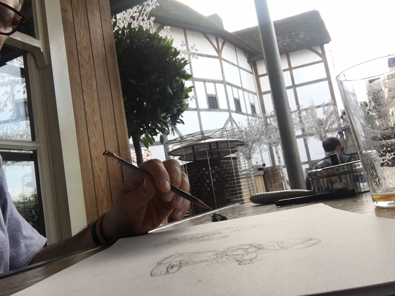 The final sitting was the best, though. In London at the time, I wandered around Southwark – Shake-dawg’s stomping grounds – and chose the bar at Shakespeare’s Globe to finish the last few drawings.