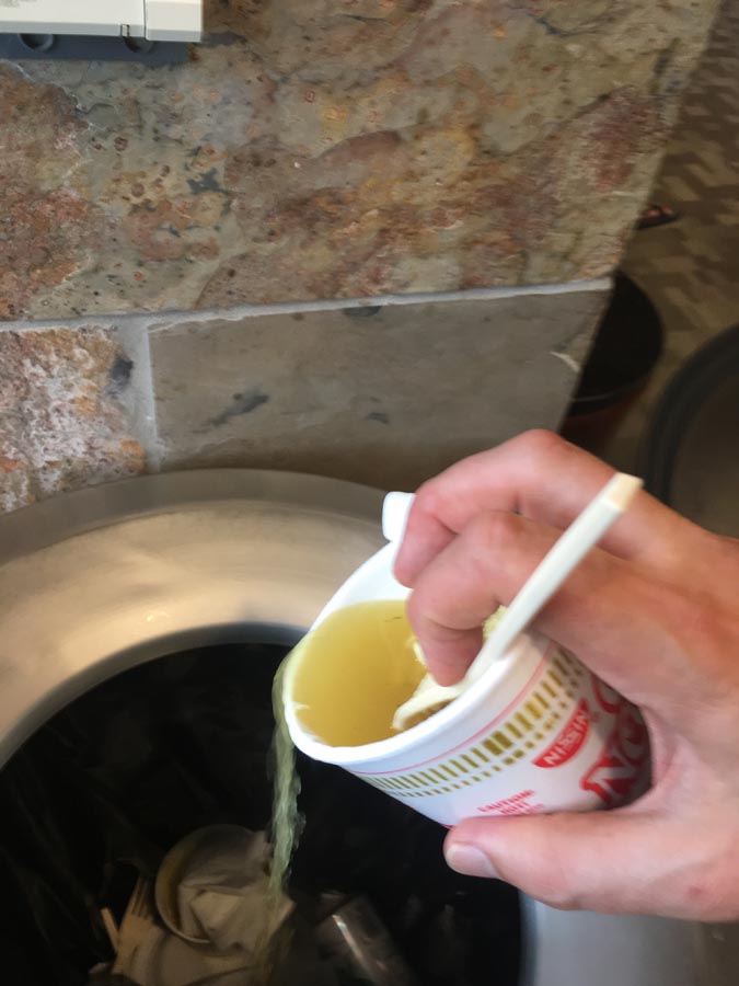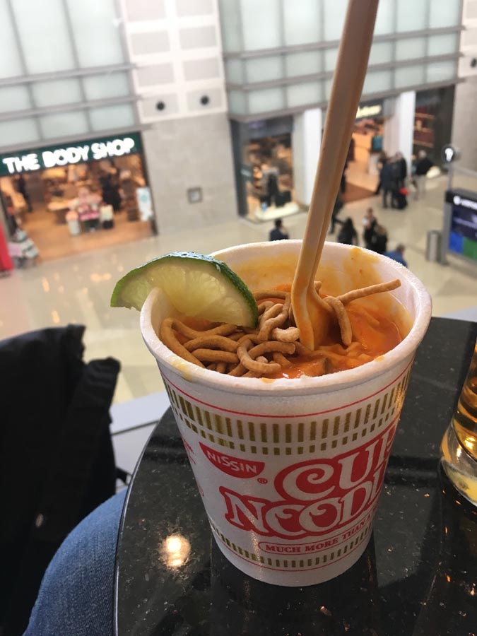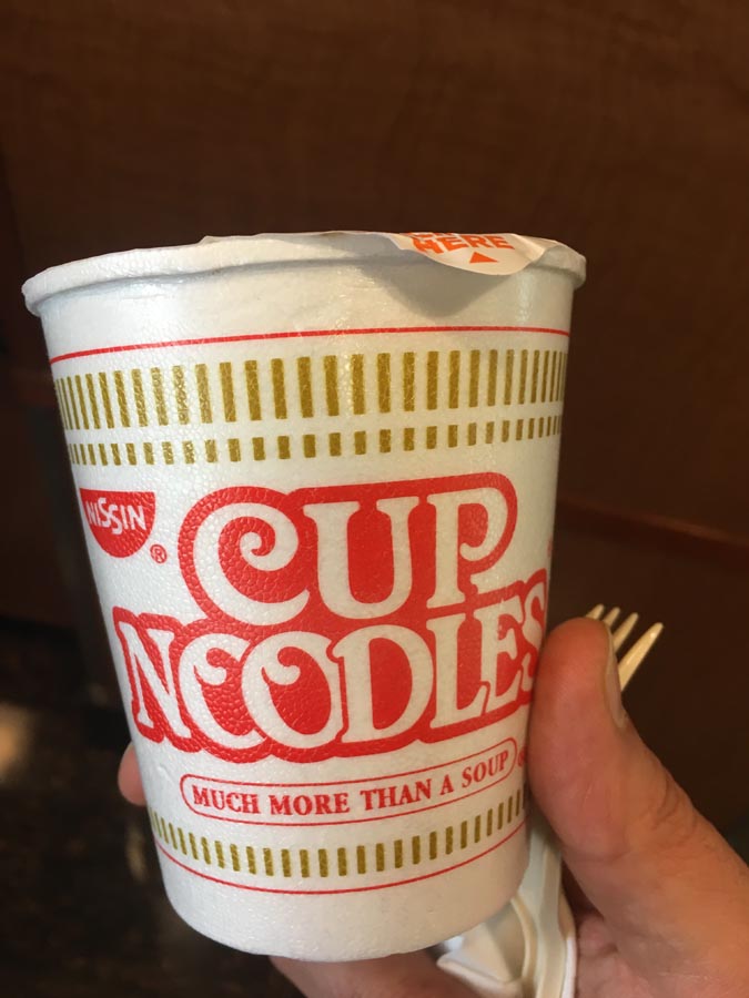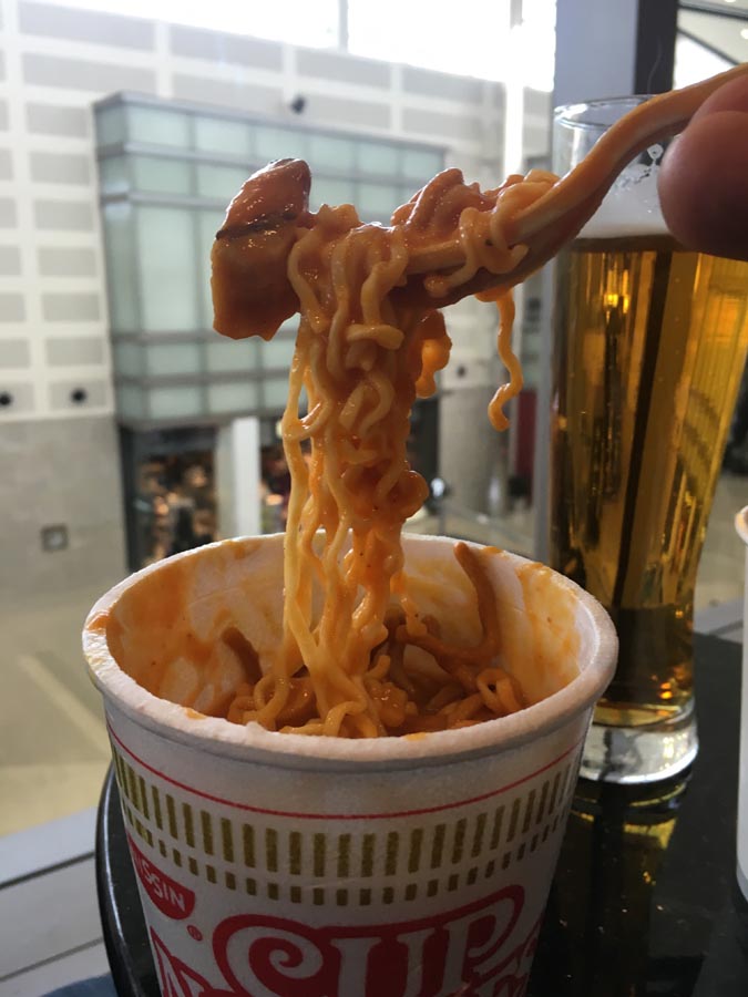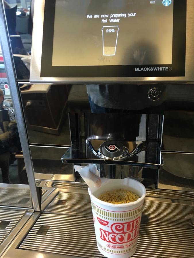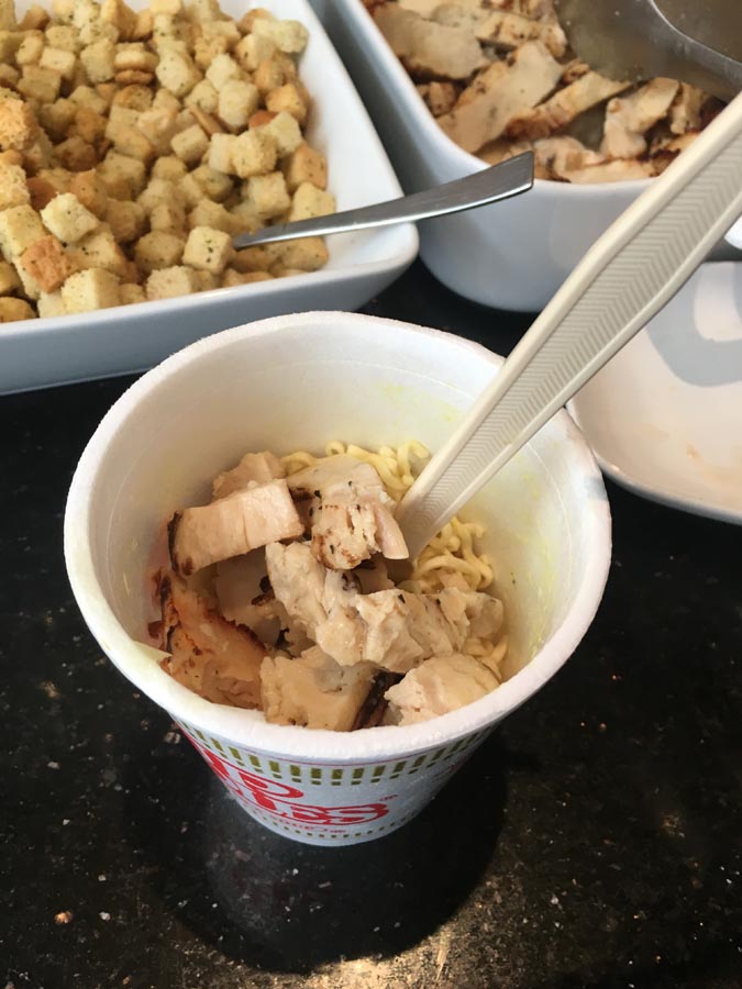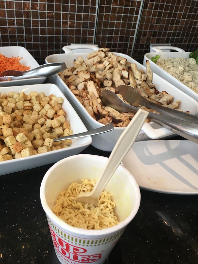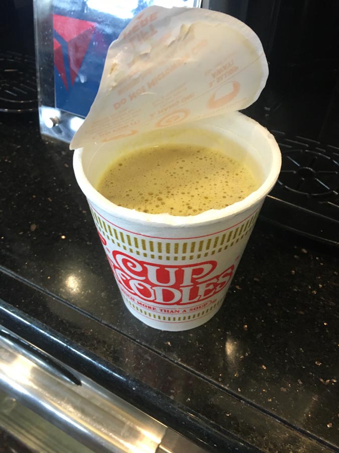 With a literal buffet of possibilities at my disposal, I experimented. STEP ONE: Take one Nissen-brand Cup Noodles ‘cup’ that some Delta Sky Clubs have been offering since (I’m spitballing, here) the upturn in Asian business.