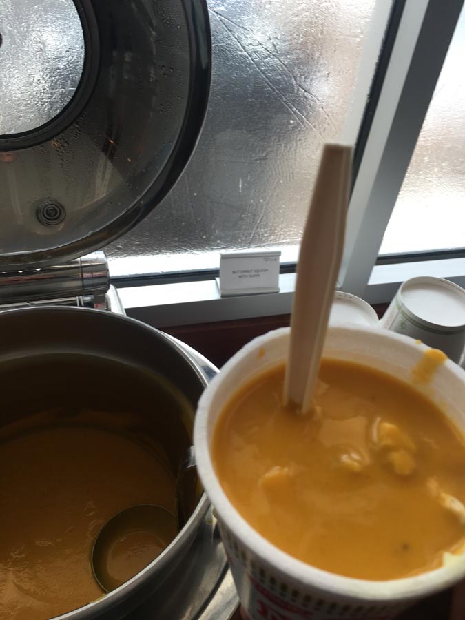 STEP SIX: Wander over to the soups. Delta usually has two available. Fill cup of noodles and chicken with either Wicked Thai or Butternut Squash Curry soups, if on-hand (others may work in a pinch – I’m looking at you, Italian Wedding Soup).