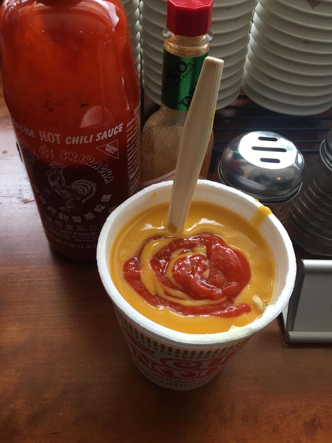 STEP EIGHT: And voila! Enjoy a tasty raman-esque snack, and smile quietly to yourself, as other patrons look in horror! Bon appetite!