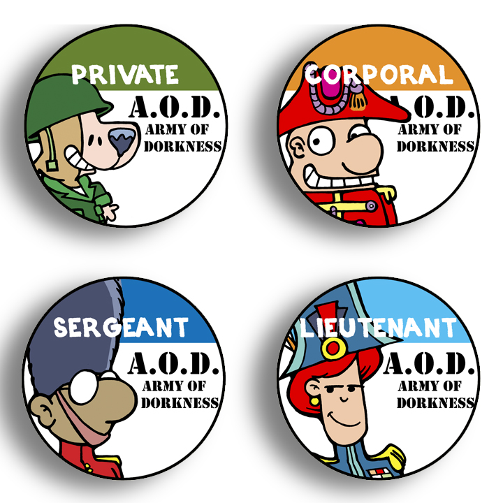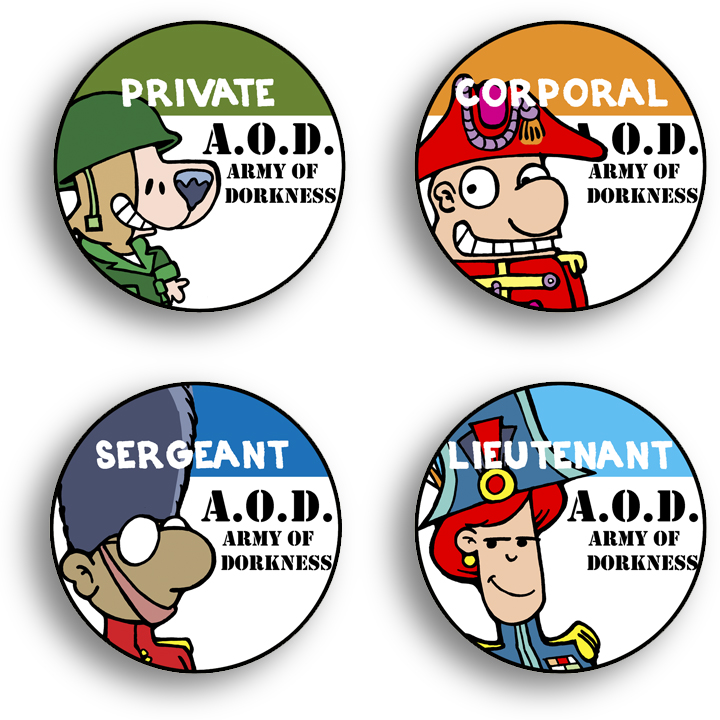 - Army of Dorkness buttons will entitle you to Dork Store discounts, once we get that up and running, along with con-meet-ups, and the like. Look, we’re still working on this. But right now, if you get three “Private” buttons, you can swap those in to be promoted to “Corporal.” Three “Corporals” will get you a “Sergeant,” and three “Sergeants” a “Lieutenant.” There will be more ranks added. There is a method to this madness.