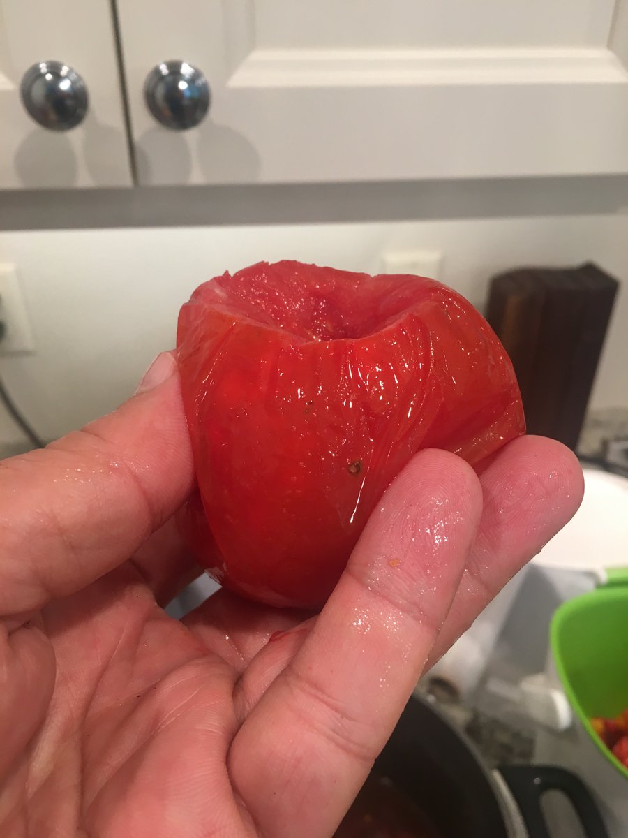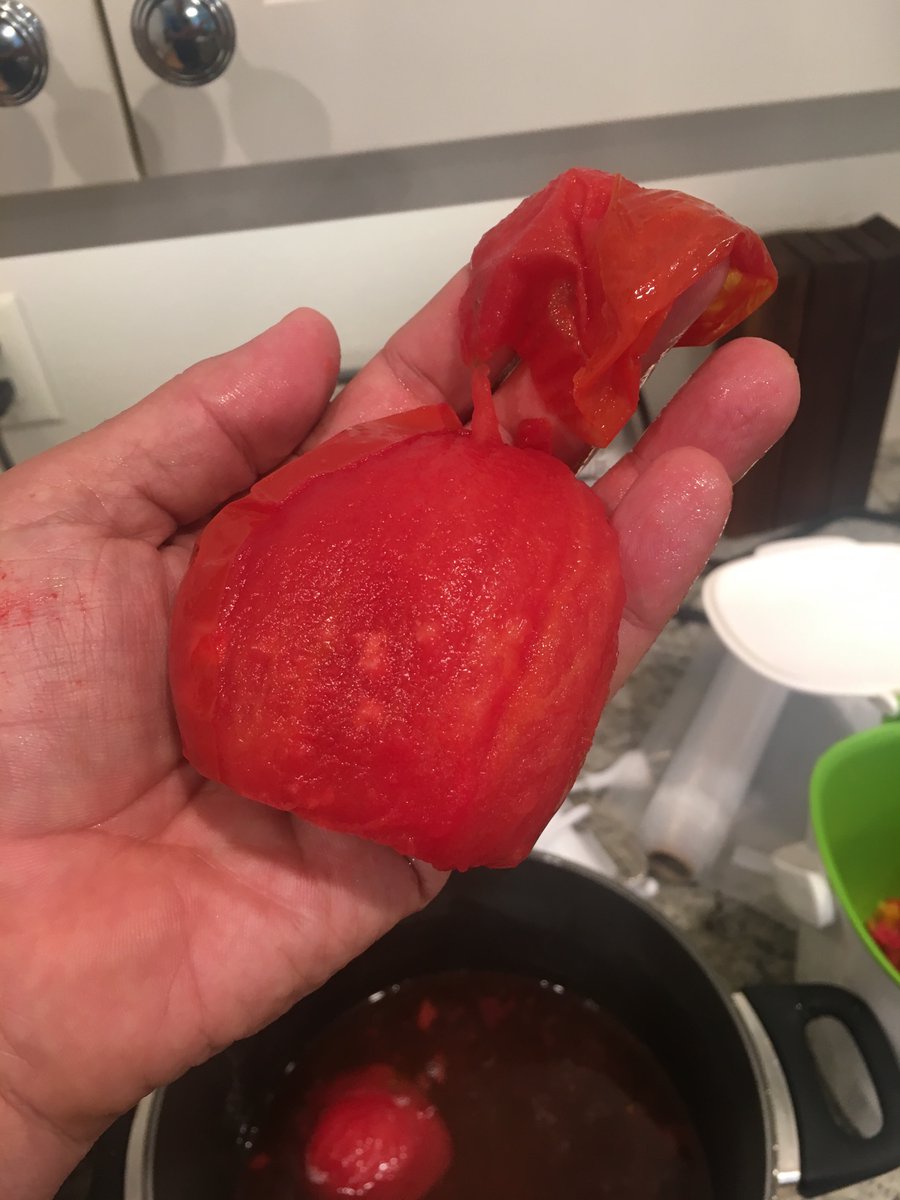 Peeling tomatoes to be preserved isn’t particularly difficult, but it usually involves blanching and ice baths, or fire-roasting – both of which can be time-consuming and messy. Particularly when you’re dealing with 10 or 20 lbs of tomatoes at a time.