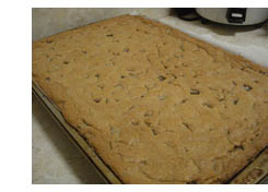 Combine the flour, baking soda and salt in small bowl. Beat the butter, the sugars and vanilla in large mixing bowl. Add eggs one at a time, beating well after each. Gradually stir the flour mixture into the butter mixture. Stir in the chocolate chips. Spread in the pan. Bake 20-25 minutes or until golden brown. (I usually go for slightly “underbaked” here, at a scant 20 minutes bake time, to keep the finished Igor Bars moist and chewy. If you prefer more solid bars, the pan cookie can be bake for a few more minutes.)