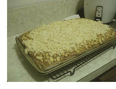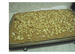 Pour the finished salty caramel over the cooled pan cookie, and spread evenly. Sprinkle the cup and a half of dry-roasted or other peanuts on top of this.