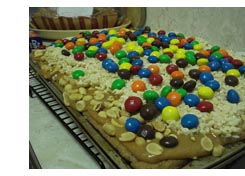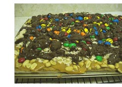 The classic Igor Bar consists of a layer of pan-style chocolate-chip cookies (although any cookie that can be baked pan-style will do), a layer of peanuts and caramel (which acts as the glue that holds the bar together), and a layer of Rice Krispie ® treats. Cut into squares, these can serve 30 or more kids. Heck, they’ve been known to take down that many ADULTS. But the big trick is to keep them moist: Igor bars should be chewy and scrumptious, not crisp and brittle.