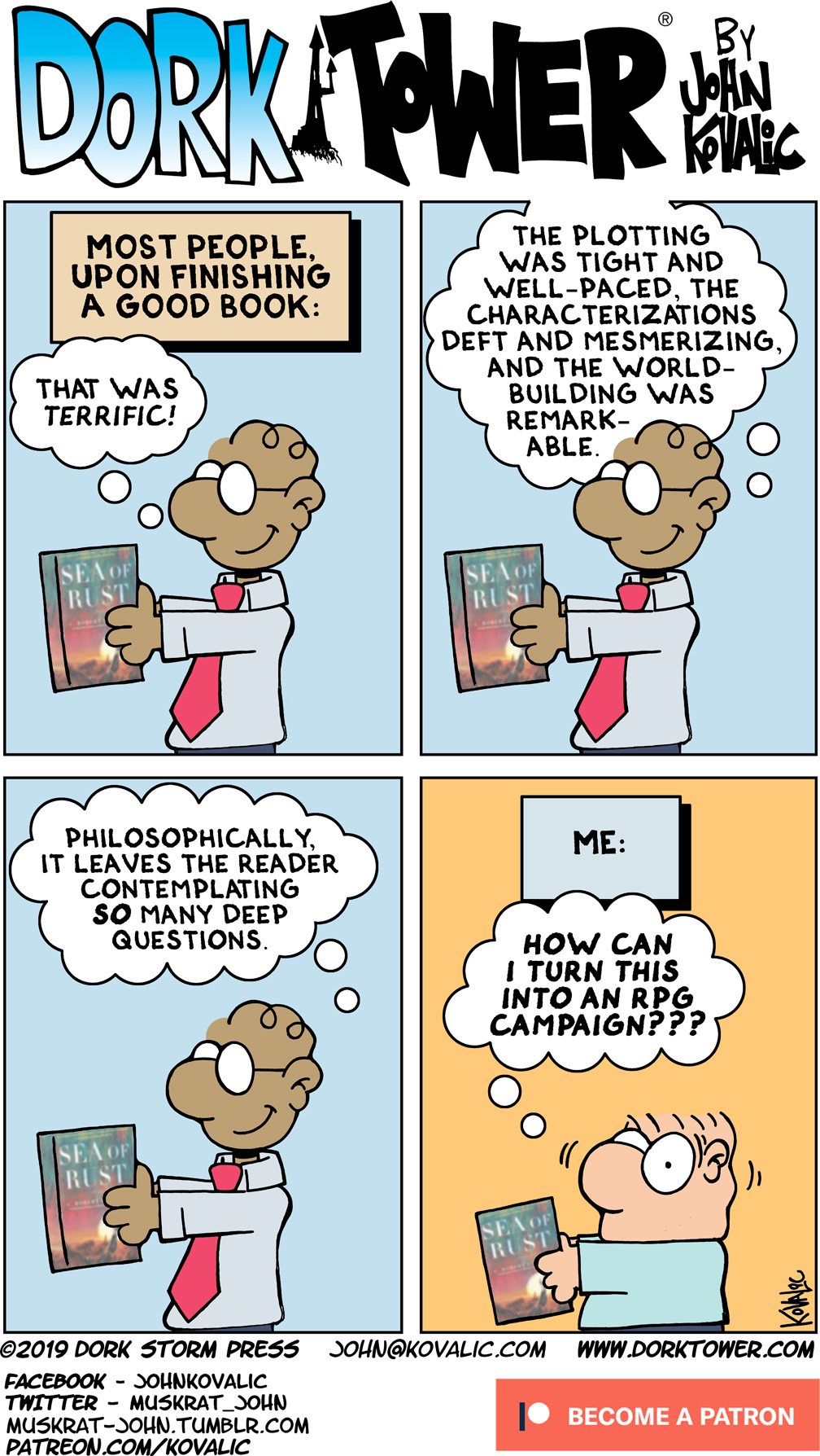 DORK ADDENDA: As I note over at the Dork Tower Patreon page, today’s strip was inspired by reading C. Robert Cargill’s “Sea of Rust“ and Gar Hanrahan’s “The Gutter Prayer,” both of which are utterly amazeballs. Check them out on Amazon – then order them from an indy bookstore!