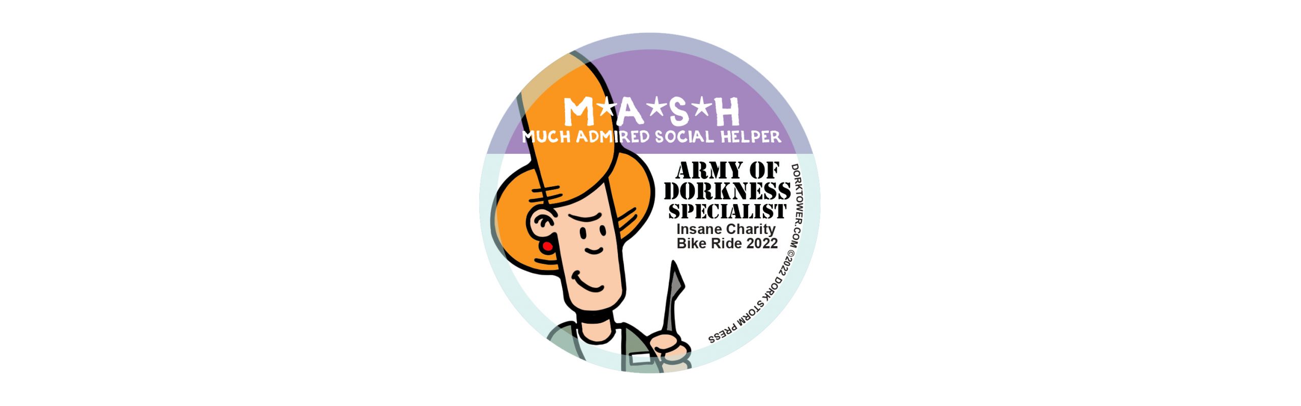Oh, and if you’re also a Dork Tower Patreon supporter, or have backed The Tao of Igor Kickstarter, and back this ride…you will also receive 2023 Army of Dorkness M*A*S*H button! Here’s a sample of the 2022 badge, with Kayleigh: