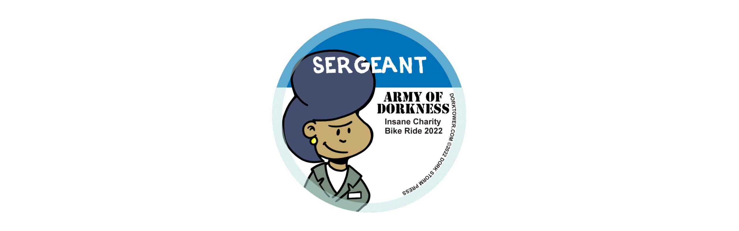 3) $75 PLEDGE LEVEL: all of the above, plus a unique-to-this-ride ARMY OF DORKNESS Sergeant button (along with any stretch-goal goodies)! Here’s last year’s button:
