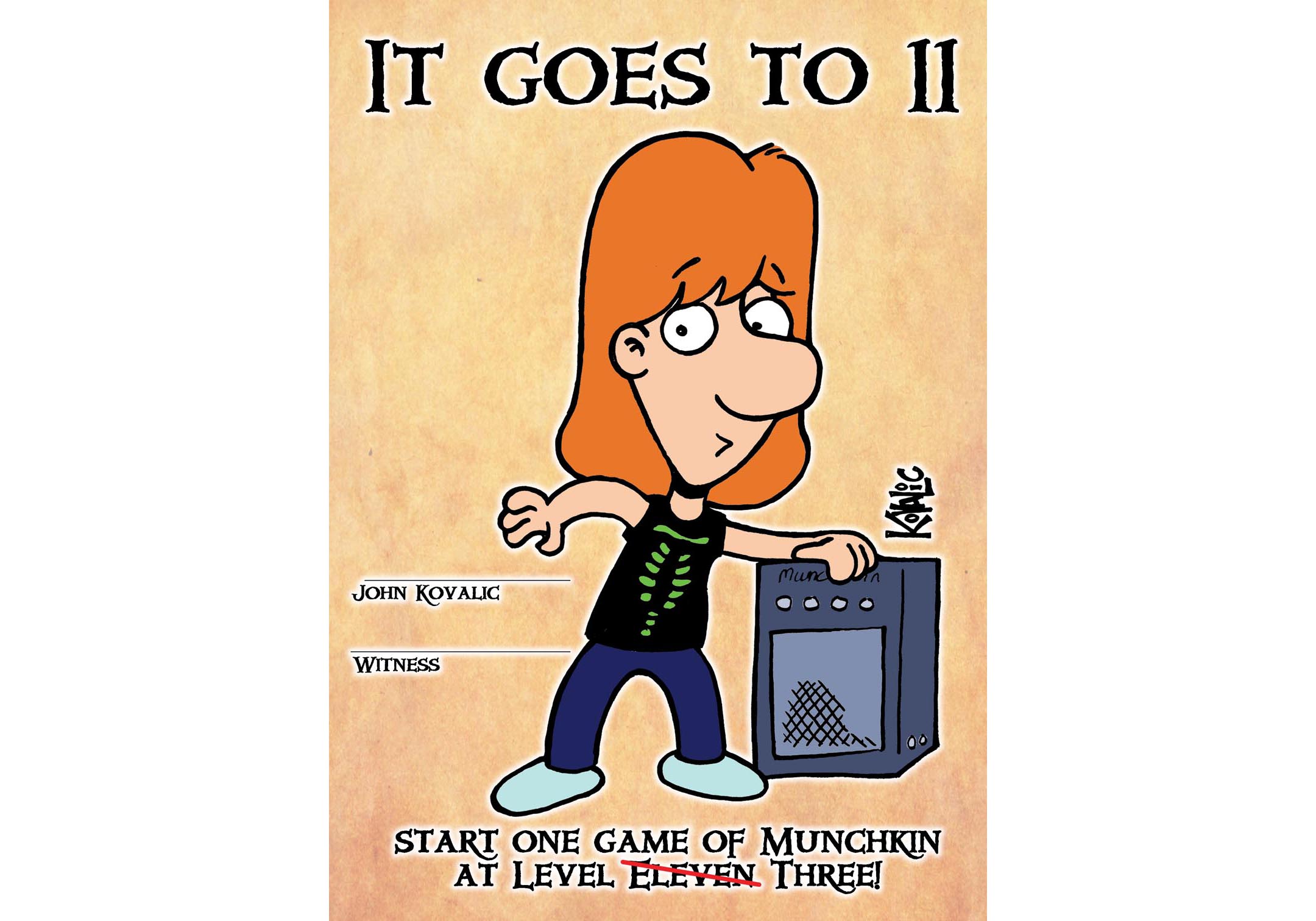 10) $2,000 PLEDGE LEVEL: you (or a friend, or a pet, etc.) will become an official MUNCHKIN card! I’ll work with you on designing the card, and you’ll get 25 copies of the card for yourself, along with the original art. These cards will also be given out by Steve Jackson Games, at various conventions world-wide. You also get a piece of Munchkin art, the current postcard, the pdfs and the badge (along with any stretch-goal goodies). (3 of 3 left)