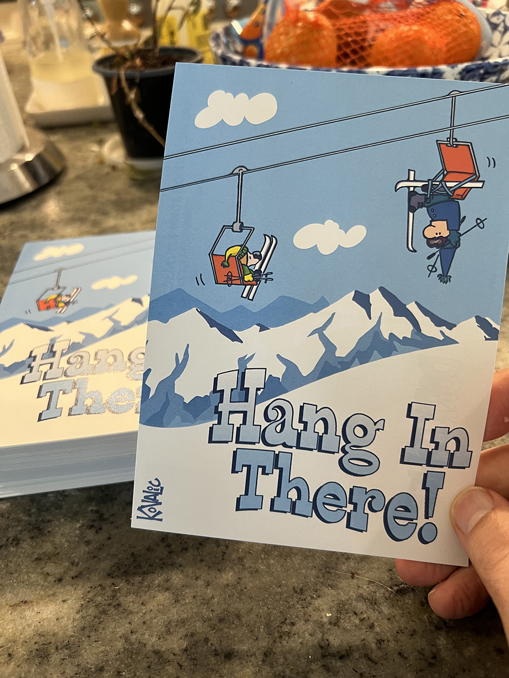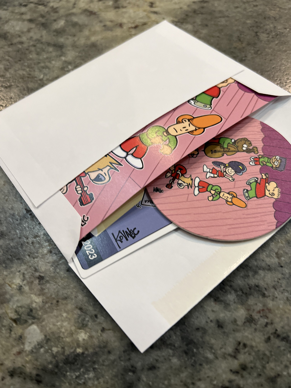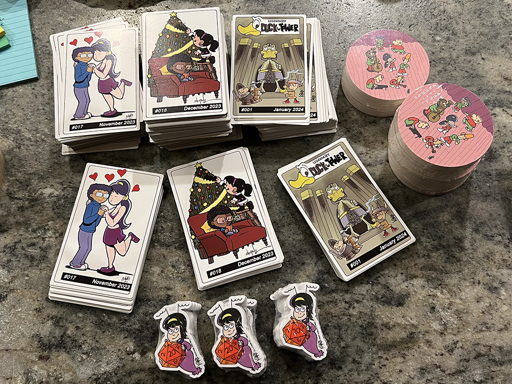 With Fulfillment Guru David’s help, I managed to get all the holiday cards off for Matt- and Gilly- level backers before I flew to London, along with the latest Collector Cards and some other holiday goodies. The January 2024 Collector Card is even in the mix – I’m not sure how long it’s been since I’ve been able to get one of these off early!