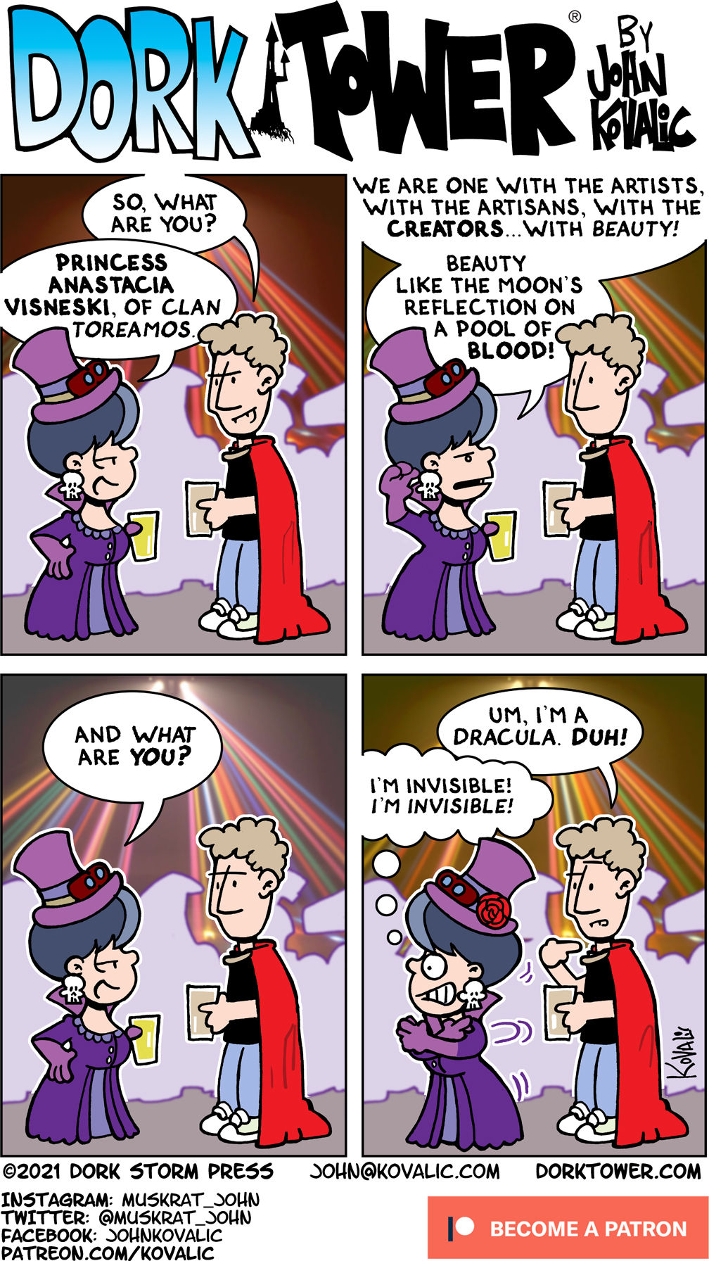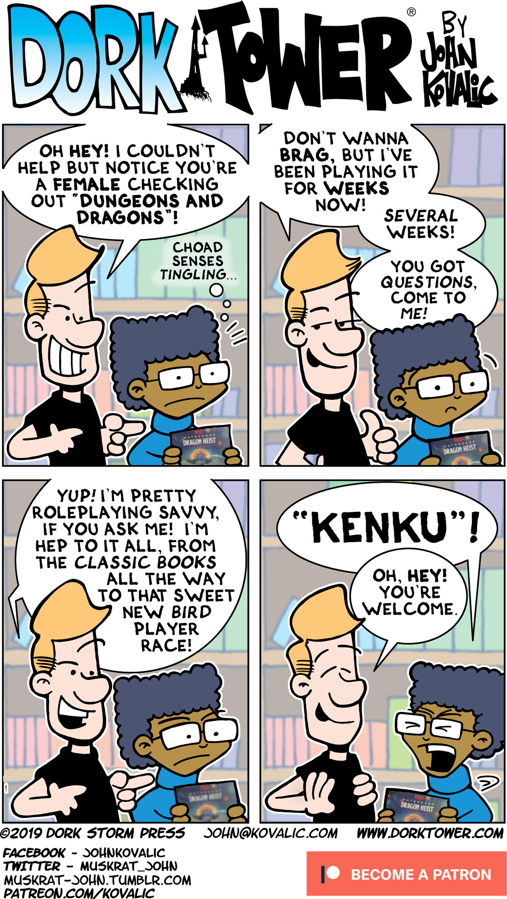 New DORK TOWER strips upload three times a week, thanks to its generous PATREON supporters! The goal is five strips a week! Enlist in the Army of Dorkness today, and help us reach that!