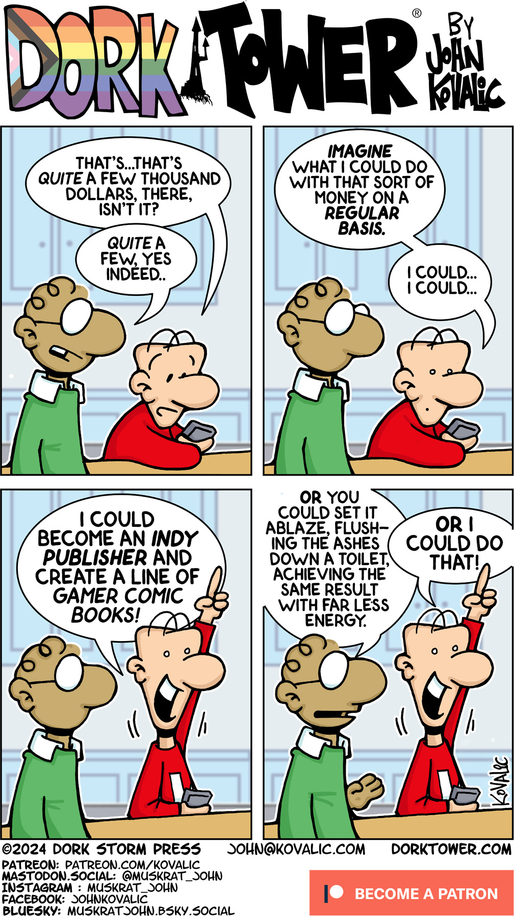 Dork Tower is updated Mondays, Wednesdays and Fridays, thanks to its amazing Patreon supporters. Help bring more Dork Tower to the world – support the DORK TOWER PATREON, (you also get swag, our eternal gratitude, and even more)! Lots of different levels to choose from, with many rewards, but every pledge helps!
