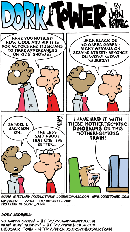 Just in case SOME OF YOU (you know who you are) do not have a toddler living in your household, here’s the “Dinosaur Train” intro, which may help explain the otherwise possibly confusing verse in today’s DORK TOWER a little: