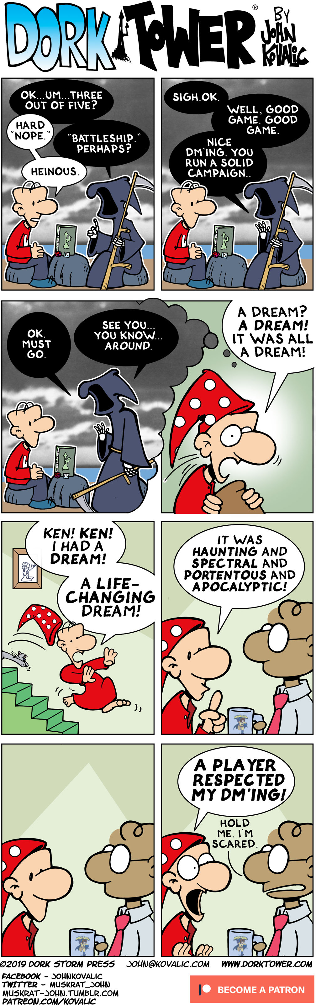 Dork Tower is made possible by its amazing Patreon backers. There’s early comics, extra comics, bonus content, swag, and more! The goal for 2019 is to reach three strips up a week, and we’re 80% OF THE WAY THERE! JOIN THE ARMY OF DORKNESS and help out, if you can!