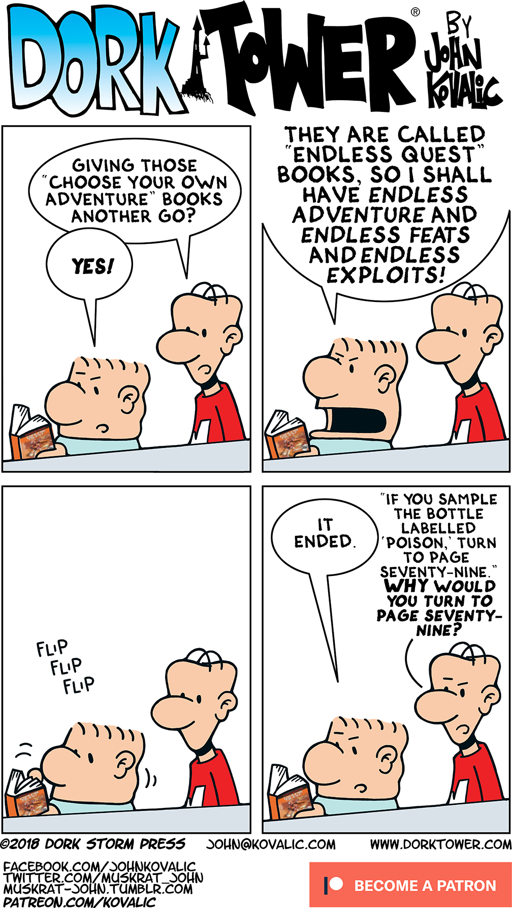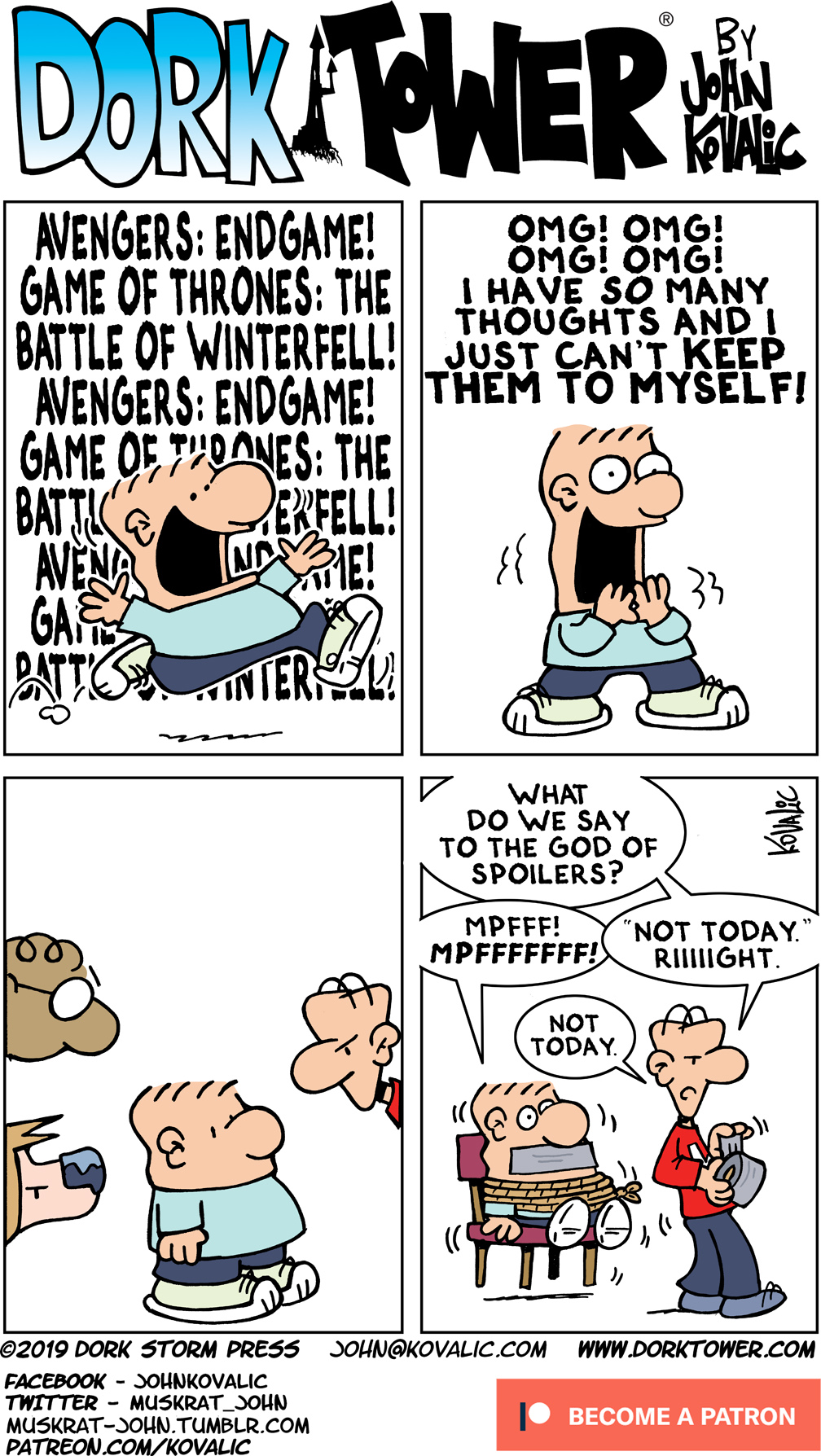 Dork Tower is updated Tuesdays and Thursdays. For as little as $1 a month, you can join the Army of Dorkness – and help bring more Dork Tower to the world! We’re nearly 80% of the way towards three comics a week! Become a Dork Tower Patreon backer – you get everlasting gratitude. Oh, wait – and also swag!
