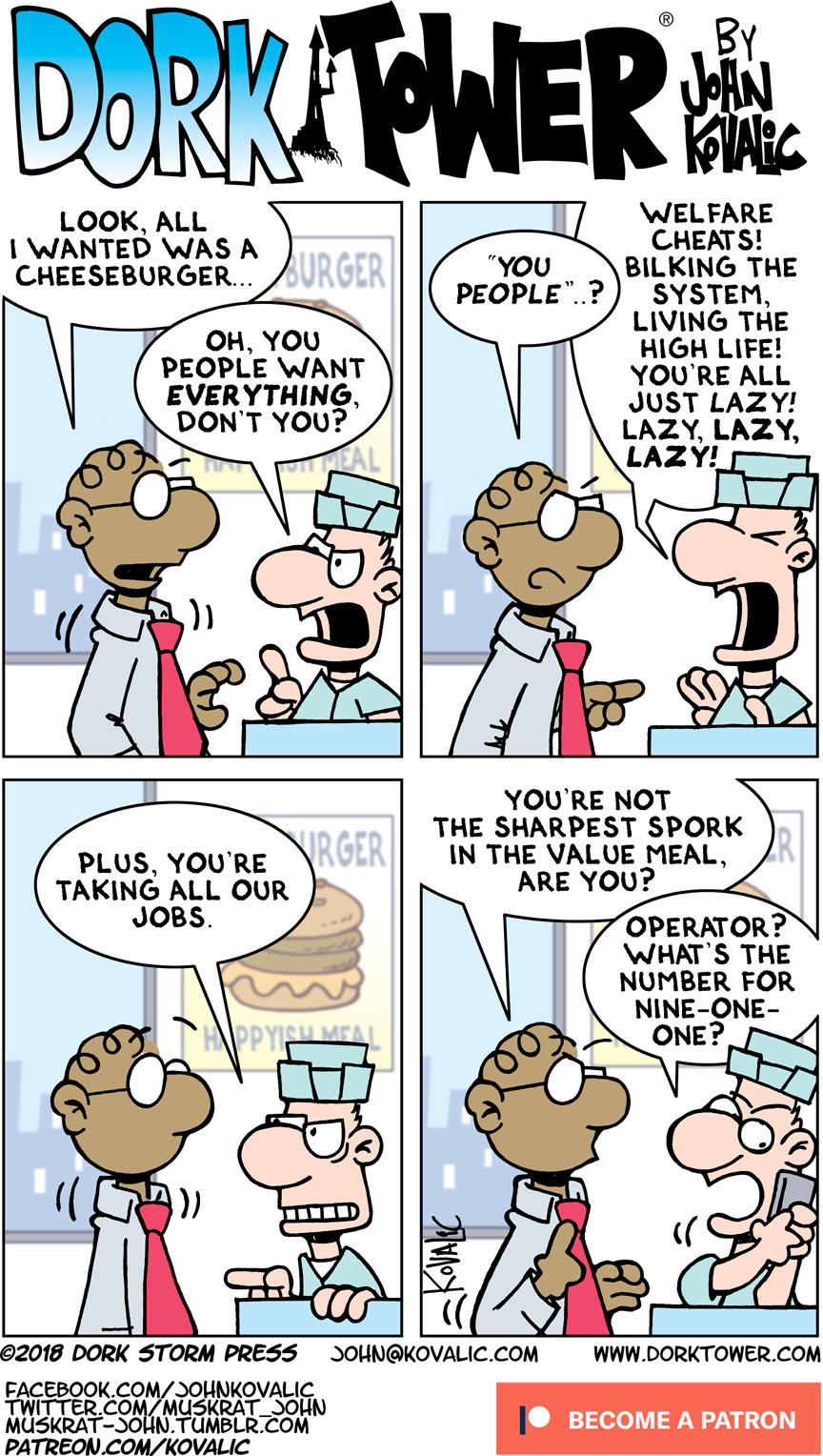 Hey! Dork Tower has a Patreon campaign with wonderful backers who help the webstrips happen. And there’s bonus comics, and swag! Sweet, sweet swag! Check it out, why don’t you? Join the fun! FUN!