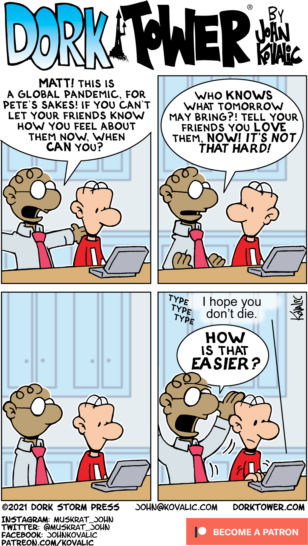 Dork Tower is 100% reader supported. Join the Army of Dorkness today, and help bring more Dork Tower to the world! By becoming a Dork Tower Patreon backer, you get John’s everlasting gratitude (and also swag, commentary, bonus strips, and more swag), but, critically, you’ll help us reach our next goal – three comics a week!