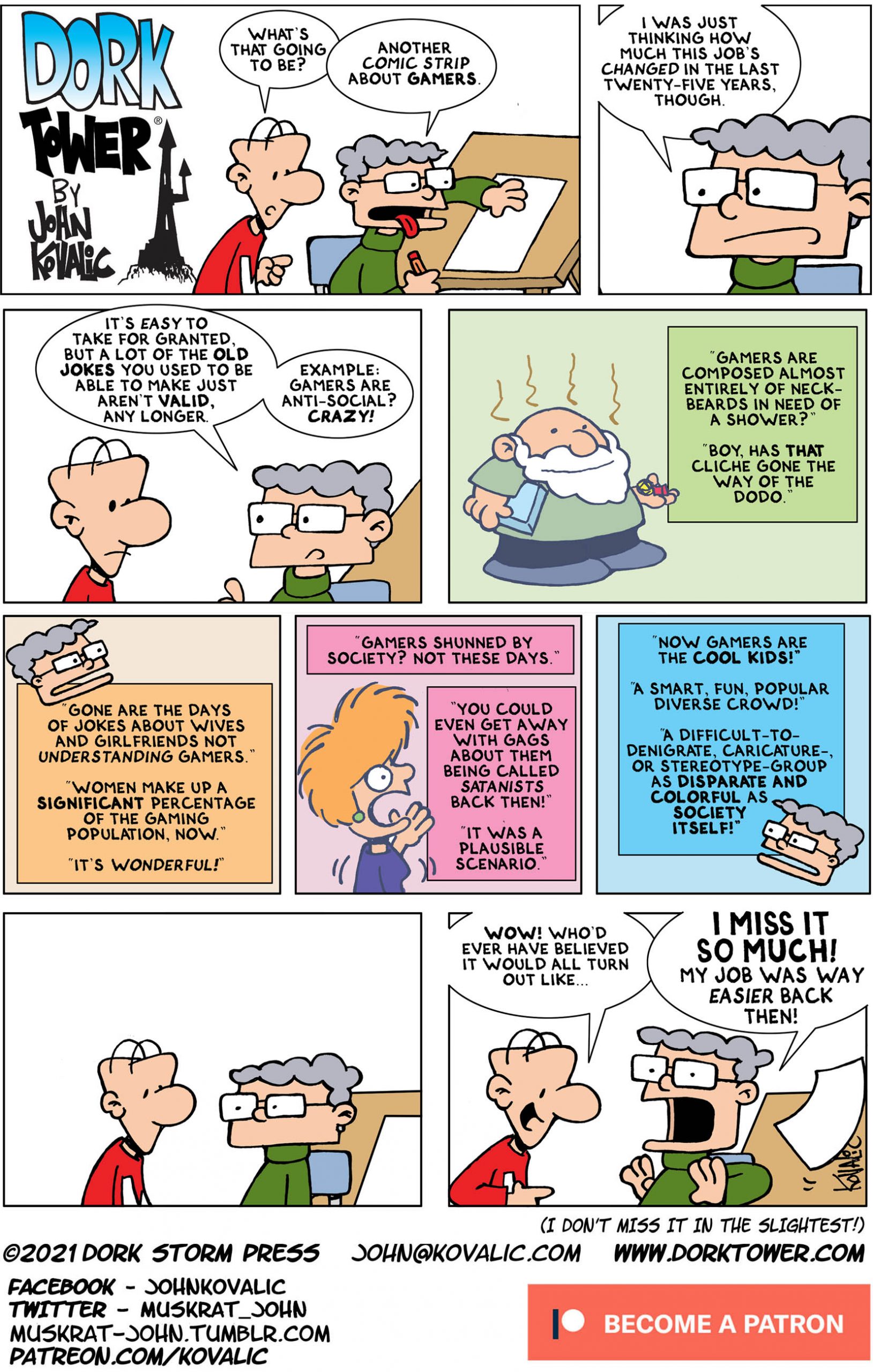 New DORK TOWER strips upload three times a week, thanks to its generous PATREON supporters! The goal is five strips a week! Enlist in the Army of Dorkness today, and help!