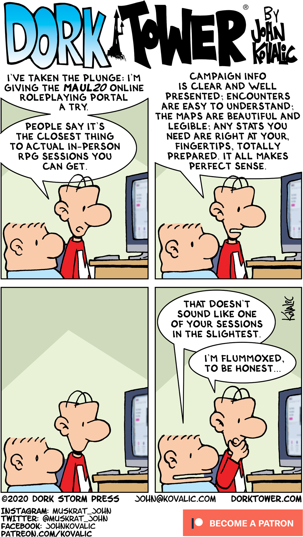 Dork Tower is updated Mondays, Wednesdays and Fridays, thanks to its amazing Patreon supporters. Help bring more Dork Tower to the world – support the DORK TOWER PATREON, (you also get swag, our eternal gratitude, and even more)! Lots of different levels to choose from, with many rewards, but every pledge helps!