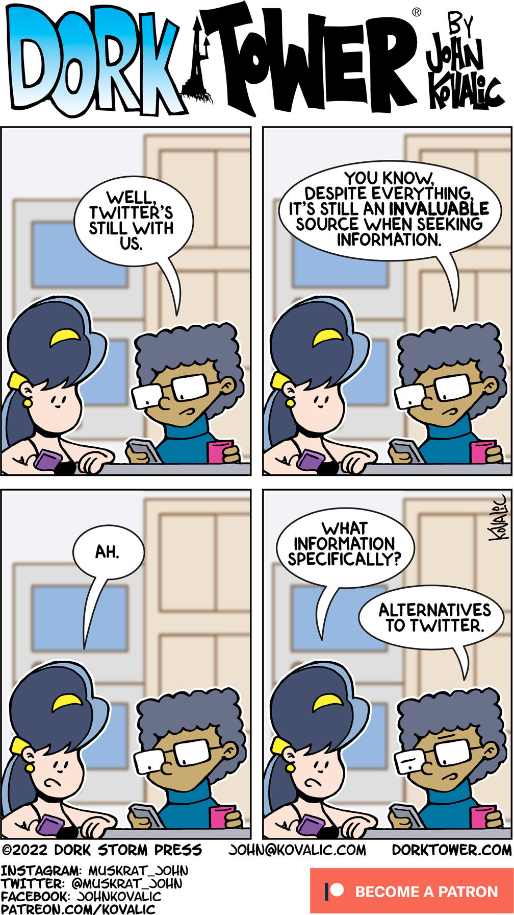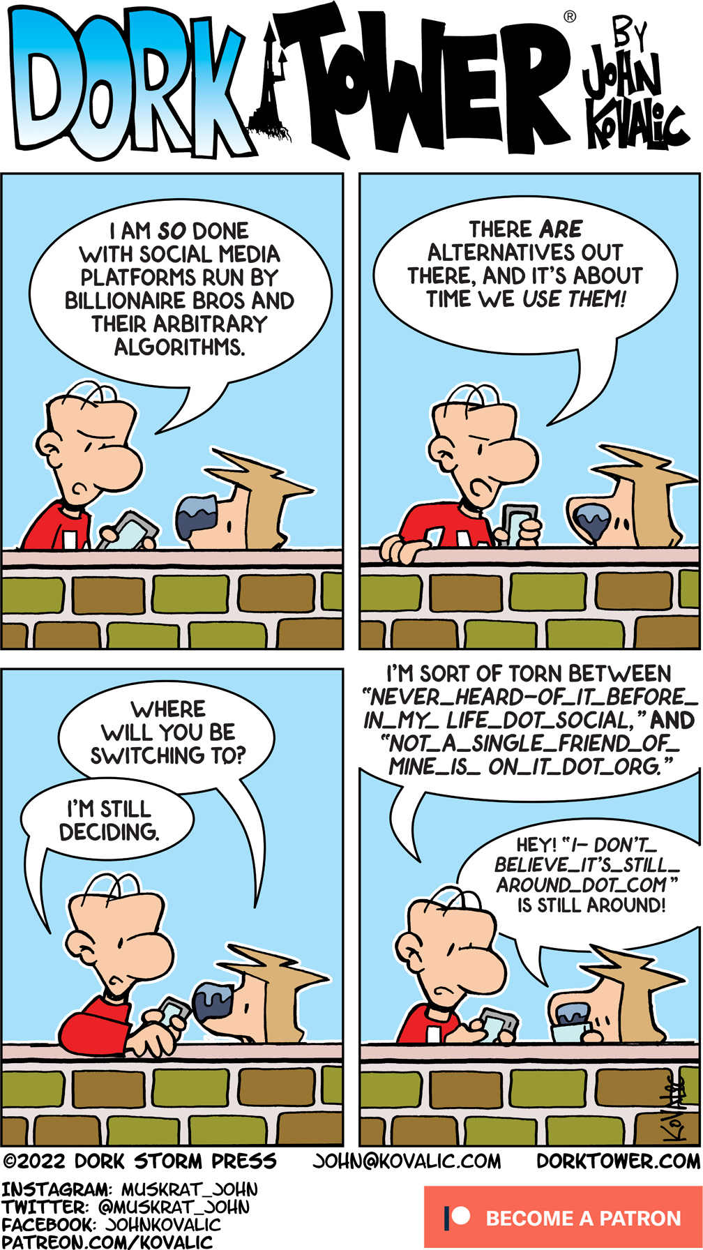 Dork Tower is updated Tuesdays and Thursdays. For as little as $1 a month, you can join the Army of Dorkness – and help bring more Dork Tower to the world! We’re nearly 80% of the way towards three comics a week! Become a Dork Tower Patreon backer – you get everlasting gratitude. Oh, wait – and also swag!