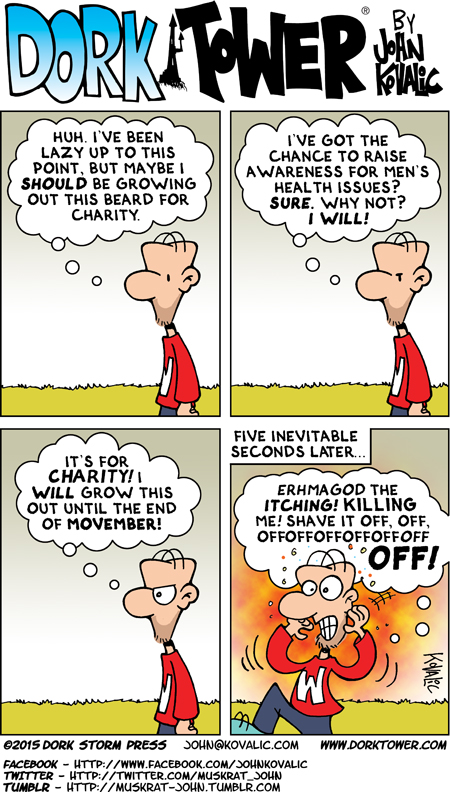 DORK ADDENDA: What is November? “Movember is the month formerly known as November, where men and women across the globe join together to raise awareness and funds for men’s health, specifically prostate cancer, testicular cancer and men’s mental health. Men (also known as Mo Bros) sign up online at Movember.com.”