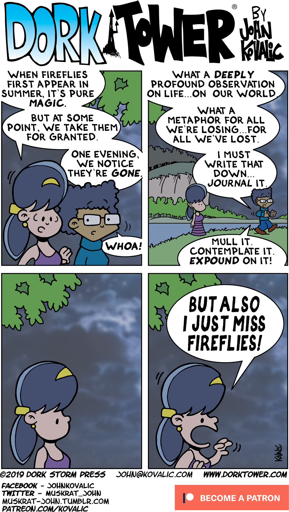 DORK TOWER is add-free, thanks to its supporters on Patreon! The comic updates Mondays, Wednesdays and Fridays, thanks to them. The next goal is four strips a week! Enlist in the Army of Dorkness today, and help!