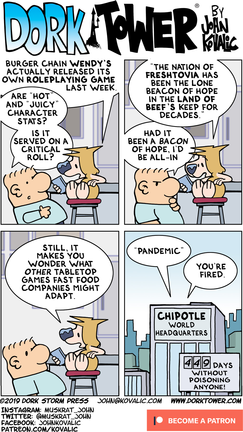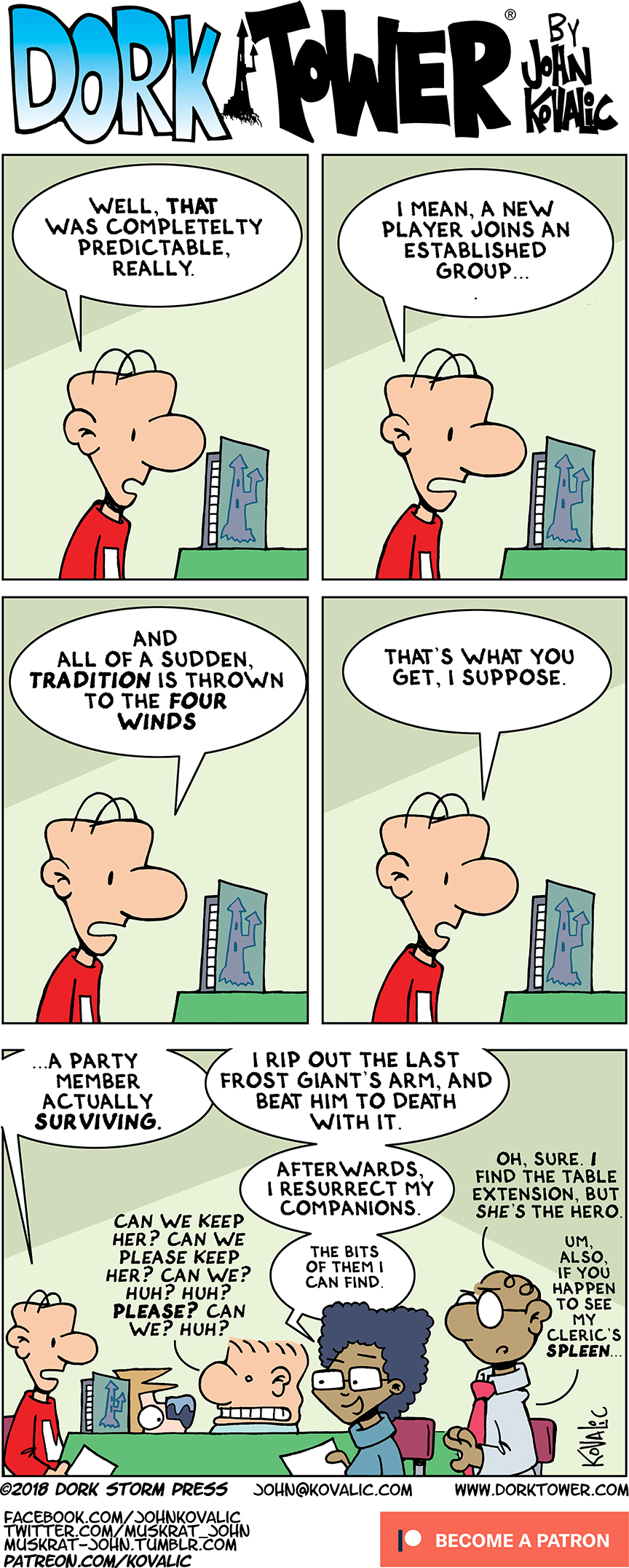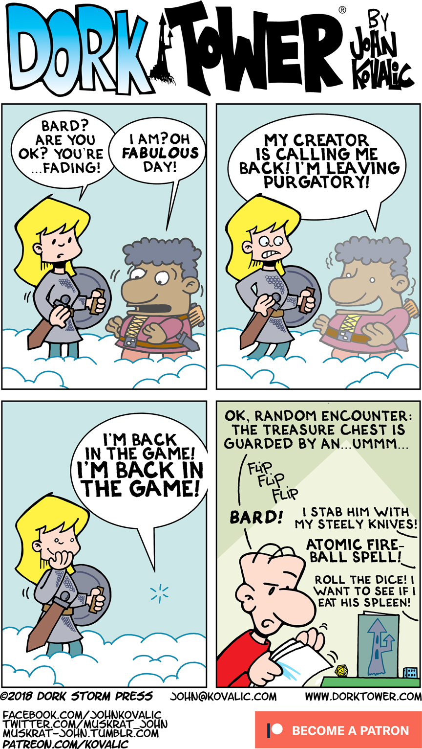 Dork Tower is updated Mondays, Wednesdays and Fridays, thanks to its amazing Patreon supporters. Support the DORK TOWER PATREON, and help bring more Dork Tower to the world (you also get swag, our eternal gratitude, and more)! Even a $1 pledge is appreciated!