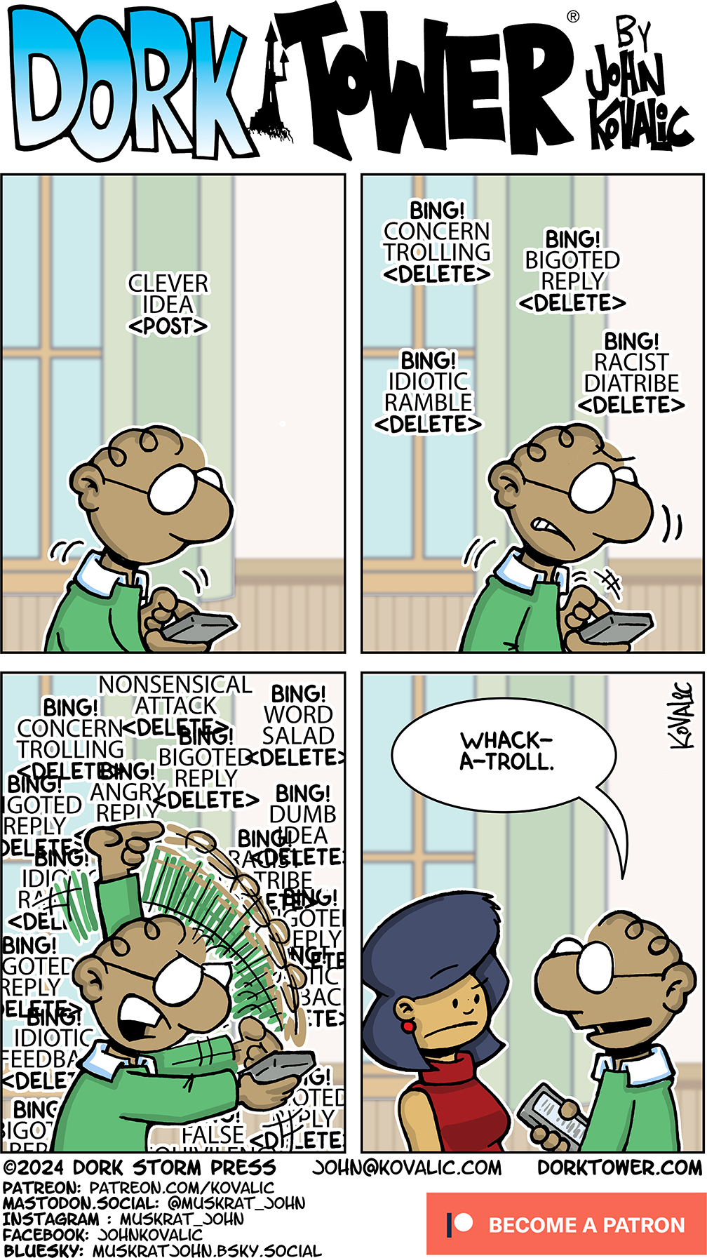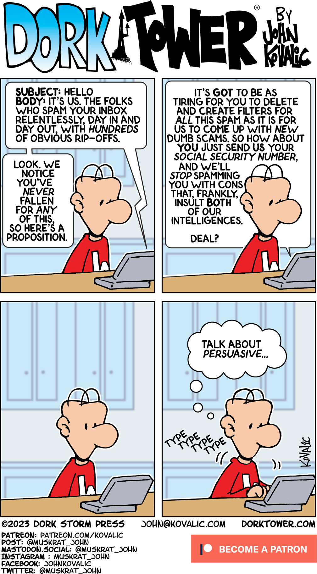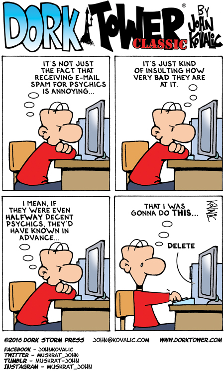 Become a DORK TOWER Patreon! Dork Tower is 100% reader-funded, and updated Mondays, Wednesdays and Fridays, thanks its generous Patreon supporters. The next goal is four strips a week! Enlist in the Army of Dorkness today, and help us reach that! We have a ton of fun! Also: swag!