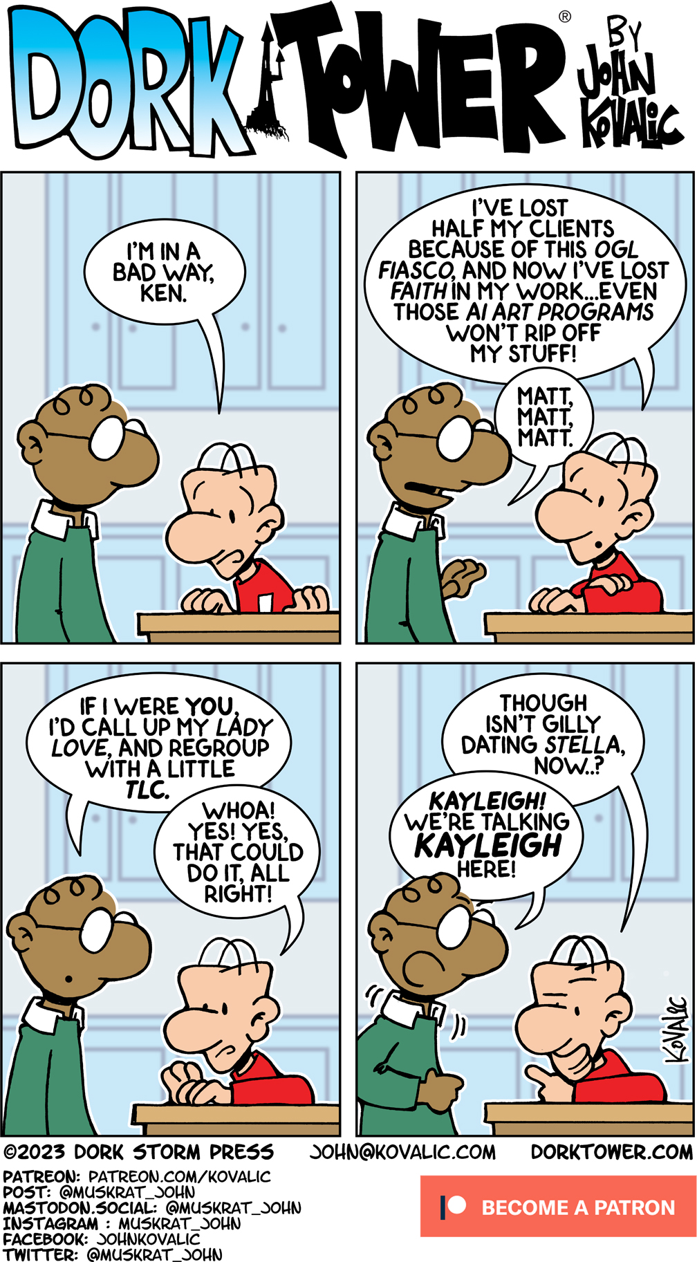 The Dork Tower Patreon goal of THREE new strips every week is within reach, thanks to our amazing patrons! Help us reach that goal: JOIN THE FUN (also see the comics early, get bonus content and swag, plus a lot, lot more) for as little as $1 a month ($.12 a comic!)