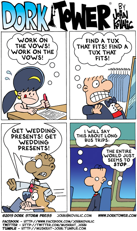 Comics are up again. Once more, for emphasis: COMICS ARE UP, AGAIN! There’s a longer post, somewhere, going into the explanation behind the half-year Dork Tower semi-hiatus. Long story short: Life Happened. So a series about Gilly’s Wedding that was supposed to take four to six weeks ended up spread over six months. I’m gonna ramble a bit here. OK. […]