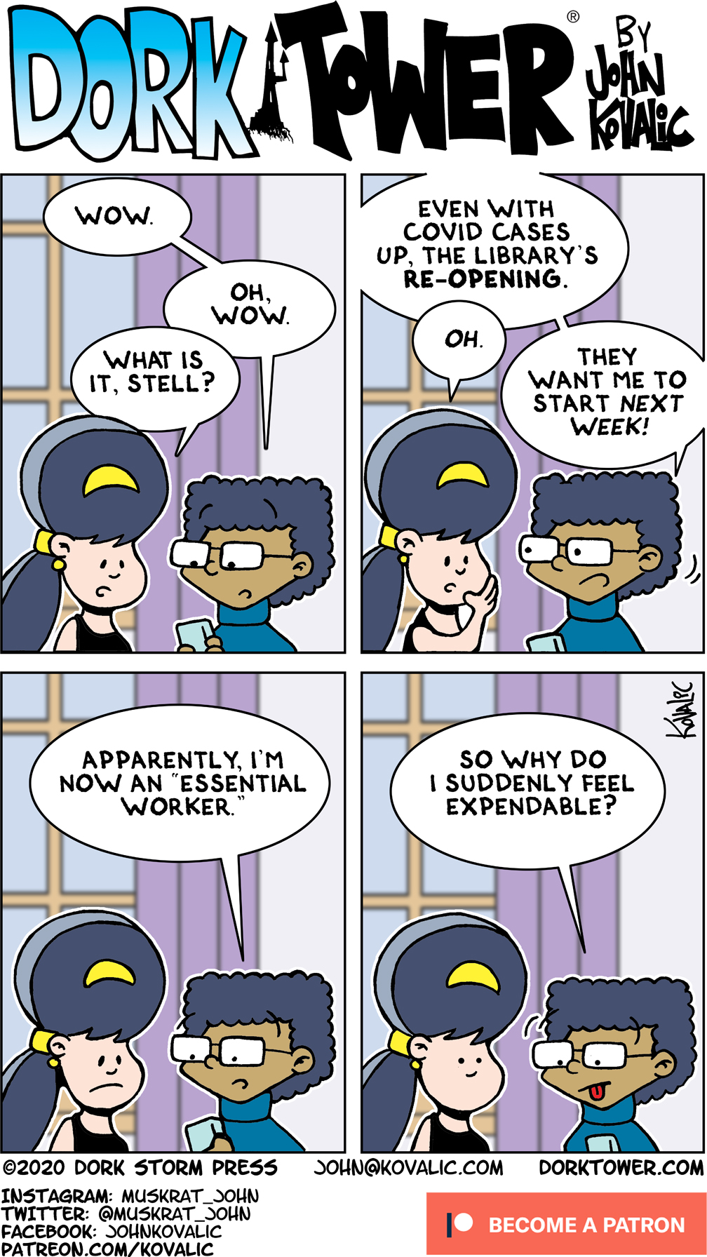 Dork Tower now runs Monday/Wednesday/Friday, thanks to reader support. The next goal is a large-format Sunday strip! Help us reach four Dork Towers a week! You’ll get swag, commentary, bonus strips, community…and our everlasting gratitude! Enlist in the the Army of Dorkness today!
